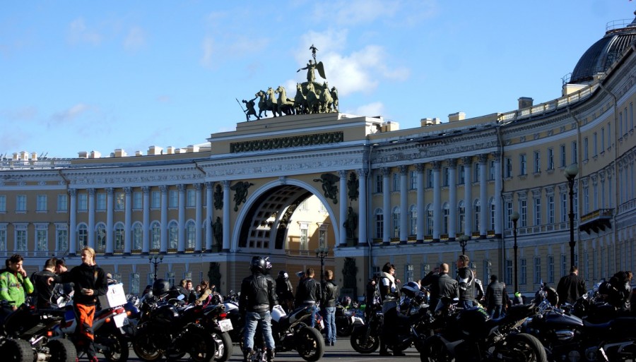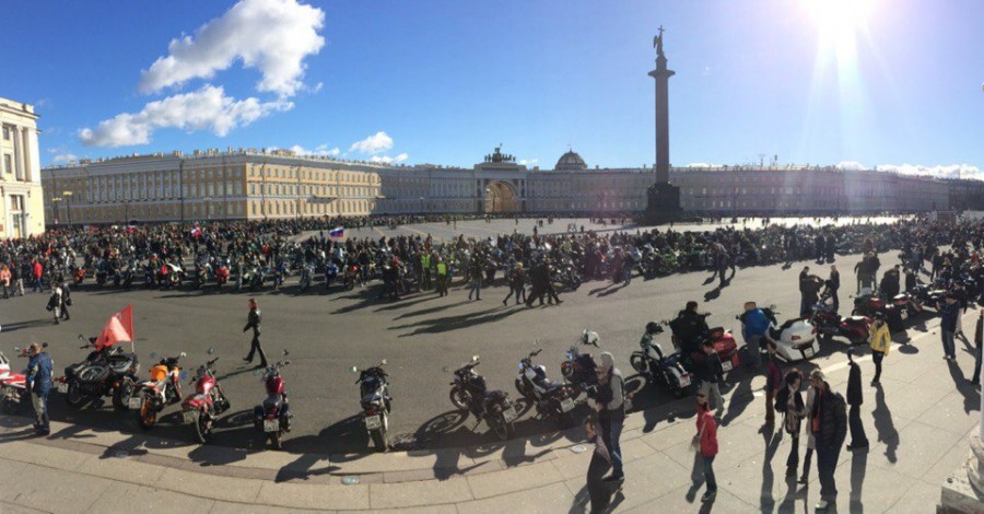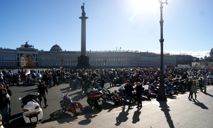 Новое стойло, а также строгие пастухи из Мотосолидарности на въезде на площадь, позволили воплотить задумку Администрации города – не допустить скопления железных лошадок на брусчатке у Александрийского столпа, развернув их красивым кольцом на асфальтированной части Дворцовой. Само кольцо было разделено на три зоны – зону организаторов Закрытия Ночных волков в начале, затем клубную зону и зону фрирайдеров.