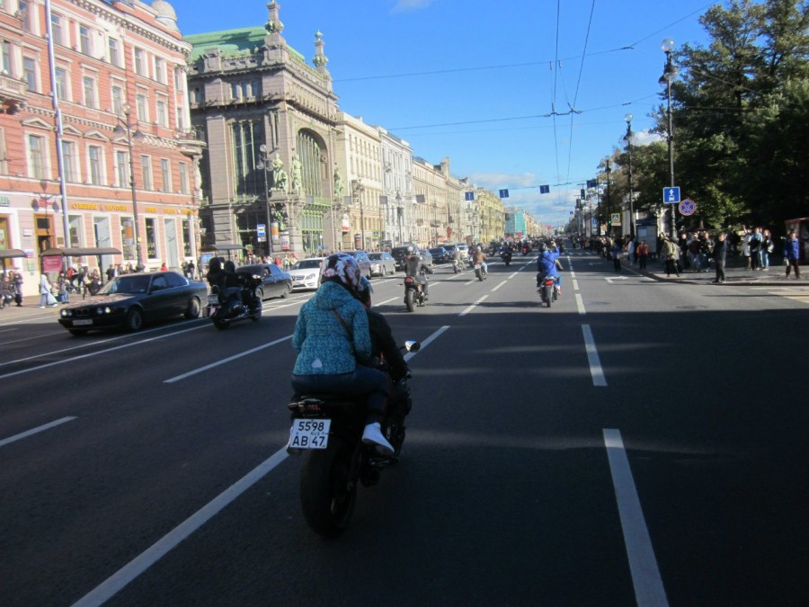 Как обычно, я уехал с площади раньше колонны, чтобы снять ее прохождение по городу. Выбранная мной точка съемки на площади Александра Невского позволила рассмотреть движение колонны в оптимальном месте – не зажатую узкой улицей, как на площади Восстания, не ускорившуюся, уже сформированную и с подуставшими нарушителями, спокойно едущими в своих рядах. Зрелище было достойное, и зрителям нравилось. Бонусом на видео в начале колонны вы сможете увидеть небольшое сражение сотрудника ГИБДД с местным бомжом в ярких одеждах, разбуженным рыком моторов и бросившимся поддерживать прохват. Пару раз они вместе эффектно перебегают сквозь движущуюся колонну, но полицейскому так и не удается поймать вонючего чирлидера.
