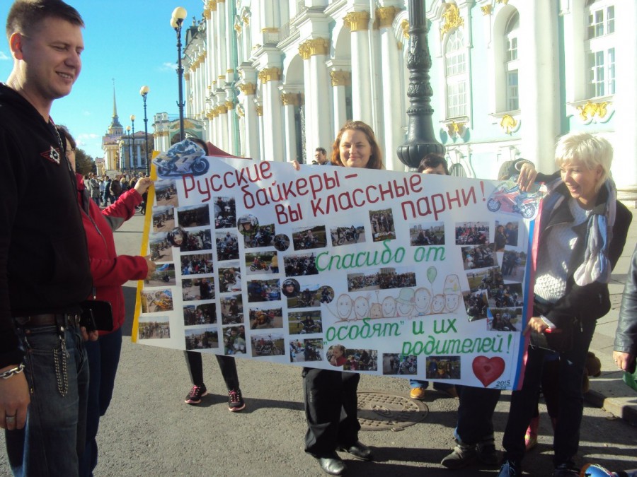В связи с тем, что мото Джим Хану соглосовать на Дворцовой не удалось, там проводилось только одно из заранее анонсированных мероприятий – встреча с особыми детьми, которую курировал Степан Дизель. На покатушки приехало около 30 детишек, которых под стенами Зимнего дворца катали добровольцы-мотоциклисты. Судя по тому, что мне в личку пишут родители детей, и на этот раз все удалось, хоть и не было так ярко и красочно, как при первой встрече. Хочу передать участникам благодарность от детей и матерей. Не смотря на праздничную расслабляющую атмосферу, вы нашли в себе силы откликнуться на желание малышей проехаться на рычащих двухколесных.