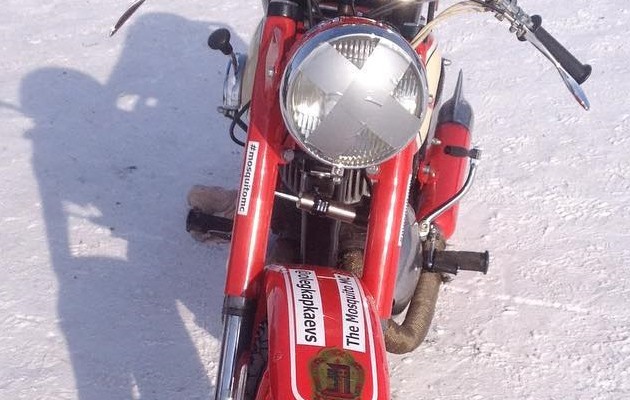 На фотографии отреставрированный ИЖ на котором выступает небезызвестный мотопутешественник Олег Капкаев. А теперь вглядываемся на надпись на переднем крыле: olegkapkaevs и The Mosquito MC.