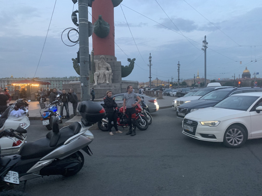 После закрытия Прибалтона - центрального места встреч Питерских мотоциклистов до 2010, тусовка переместилась за Стрелку и по 2013 собирались у первой колонны. Но в 2013 там начали делать ремонт и компания, как-то ужившись с танцорами, переехала на вторую.