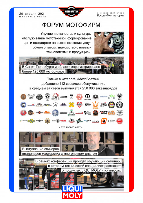 МотоБратан продолжает развитие Питерской мотоиндустрии и 20 апреля вместе с Liqui Moly проводит первый Форум мотофирм, мастерских и магазинов.