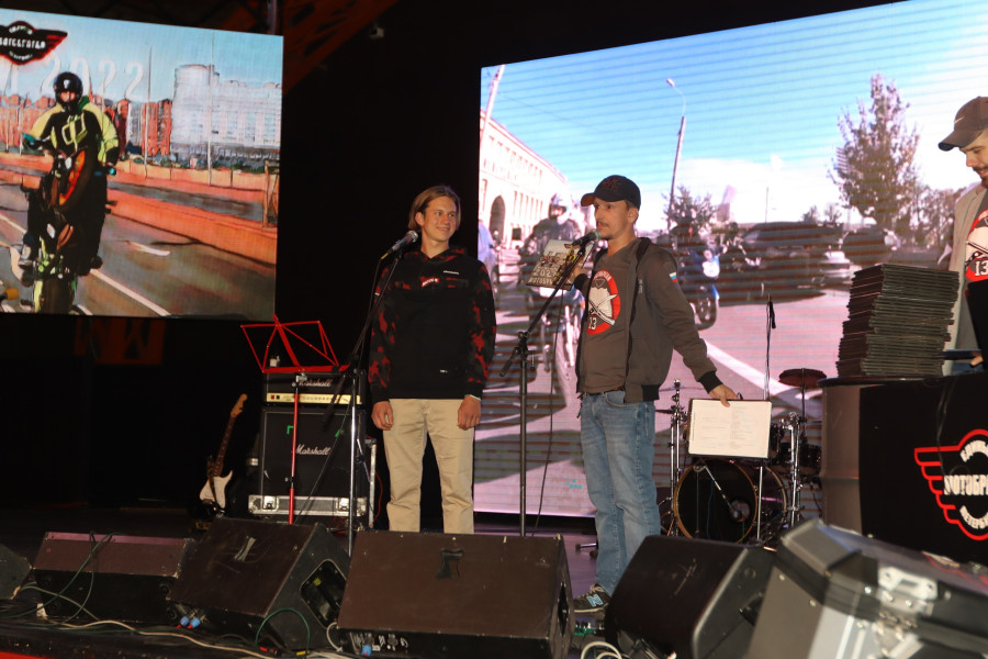 В качестве памятного подарка был холст с фотографией Фомы Калинина во главе колонны на Закрытии мотосезона. Наш чемпион мира по стантрайдингу и чемпион России по шоссейно-кольцевым мотогонкам лично вручал сувениры.