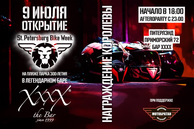 Стало известно, что открытие St.Petersburg Bike Week будет проходить в баре XXXX, на пляже парка 300-летия, начнется в 18:00 и закончится after-party в тех-же иксах.