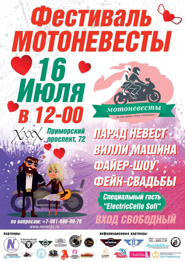 Ожидаемый всеми фестиваль МотоНевест состоится 16 июля по адресу: Бар ХХХХ, Питерленд, Приморский пр. 72 Подробности