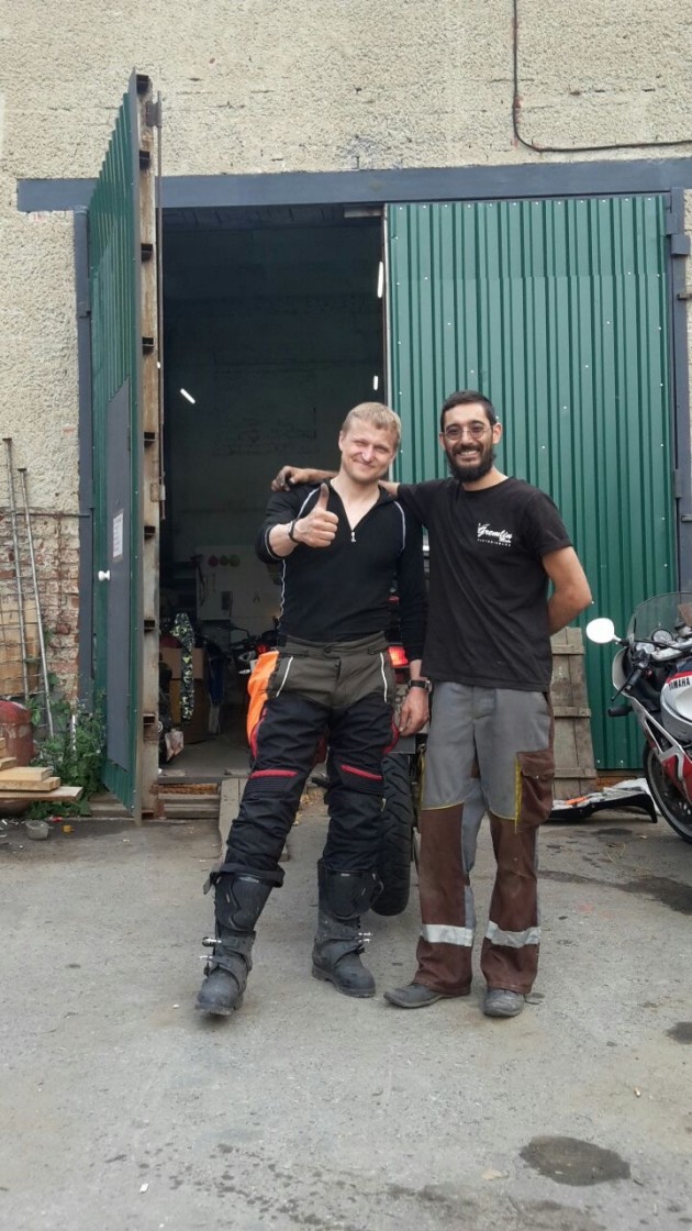 19:07: «Я починен! Одеваюсь и в путь! ))) Огромное спасибо Мише (СПб), Денису (Екб) и Вахтангу (Гремлин-мото)!!! Благодоря этим замечательным людям я еду дальше к своей мечте! ))) не считайте рекламой, но отличный мотосервис: Екатеренбург, ул. Труженников, 1а, тел. 89090000866, 89221258112. Здесь всегда помогут, потому что люди хорошие! Еще раз спасибо!!! )))»