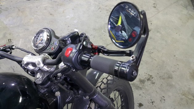 На мотоцикле появился новый руль, зеркала интересной формы, новая фара с защитной решеткой, на бак заказали резиновые накладки, на вилку гофрированные резинки.