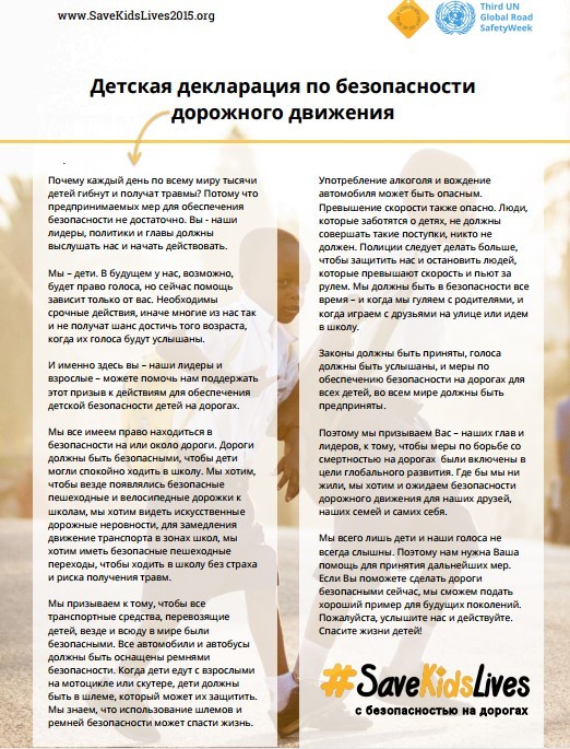 С 4 по 10 мая 2015 года во всем мире пройдёт Третья Глобальная неделя безопасности дорожного движения ООН, объявленная резолюцией Генеральной Ассамблеи ООН «Повышение безопасности дорожного движения». Её главной темой станет безопасность детей на дороге, которая отражена в хэштэге #SaveKidsLives (#СпаситеДетскиеЖизни)