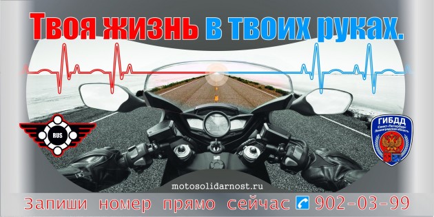 Предложение было поддержано старшим инспектором отдела пропаганды безопасности дорожного движения УГИБДД по г. Санкт-Петербургу и Ленинградской области Козаком Андрем Викторовичем и остальными участниками инициативного собрания. Реализацией занялся Павел Чернов (Мотовоз) и автор этой статьи. Благодаря участию дизайнера Виктории Тихомировой было разработано несколько макетов социального баннера размером 2 на 3 метра, и отдано на согласование.