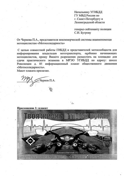В рамках совместной работы ГИБДД и мотообщественности Санкт-Петербурга по профилактике предотвращения ДТП с участием мотоциклистов и взаимопомощи на дорогах, прошу Вас рассмотреть возможность бесплатного размещения социального плаката общественного движения "Мотосолидарность" на площадке для сдачи практического экзамена в МРЭО УГИБДД по адресу: шоссе Революции д. 85.