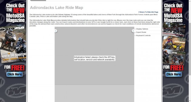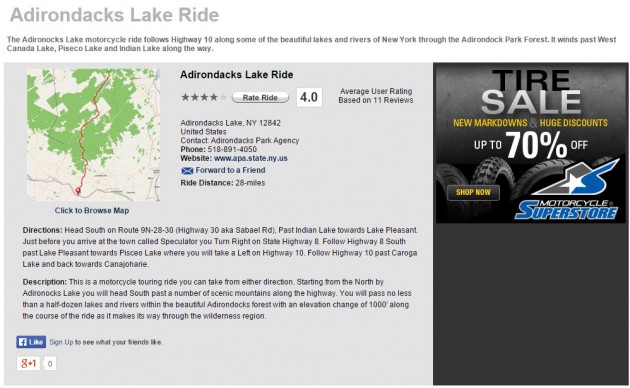 Описание: Это мотоциклетная прогулка, где можно ехать в любом направлении. Начиная с севера от озера Adironocks вы едете на юг мимо ряда живописных гор вдоль шоссе. Вы не проедете мимо не менее полудюжины озер и рек в пределах красивого леса Adirondocks с перепадом высот до километра по ходу поездки.