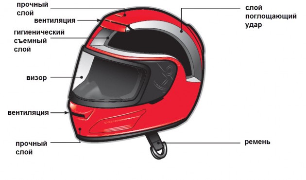 Шлемы имеют 4 слоя. Первый наружный слой - краска для красоты. Второй прочный пластиковый защищает от удара. Третий внутренний слой из пенопласта медленно разрушается при ударе, поглощая силу удара и распределяя ударную волну по всему объему. Четвертый слой - это вкладыш из ткани служит для комфорта, который может выниматься для стирки.