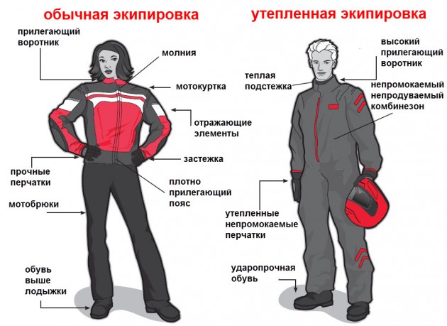 Защитное снаряжение имеет два основных цели: комфорт и защиту. Поэтому производители мотоэкипировки выпускают модели для различной погоды и различных условий эксплуатации: ударопрочной, ветрозащитной, теплой, непромокаемой, заметной на дороге, не стирающейся при падении, проветриваемой и так далее.