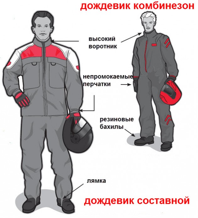 Несмотря на использование высокотехнологичных материалов при изготовлении экипировки для мотоциклистов, в дождь она довольно быстро промокает. Лучшим способом защиты в этом случае считается использование прорезиненного дождевика, комбинезона или раздельного, а также бахил. Их рекомендуется всегда возить с собой и одевать при приближении дождя или снега.