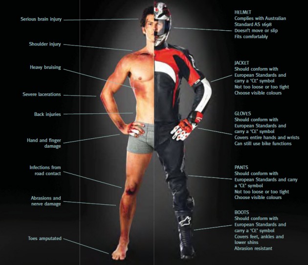 Эти элементы защиты должны быть сделаны из специальной ткани, не рвущейся и плохо стирающейся при скольжении по асфальту в случае падения. Они должны обеспечивать комфорт для тела в ту погоду, в которую мотоциклист отправился в путь. То есть они должны быть продуваемыми в жаркую погоду, сберегающими тепло в холодную погоду, непромокаемыми в дождь. Кроме того у них должны быть встроены защитные элементы типа защиты предплечий, спины, ног, плеч, колен и так далее. Обычно это пластиковые защитные элементы. Допускается ношение не встроенных элементов типа "черепахи", защиты ног и рук. Производители стараются вшивать светоотражающие элементы в необходимых местах в своих изделиях.