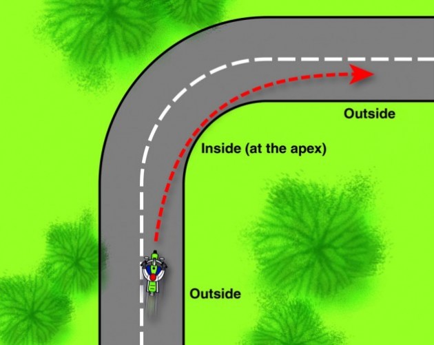 Входя в обычный открытый поворот, где дорога видна и она не изменяет свое направление под острым углом, мотоциклист старается начать его с левой части полосы движения. В повороте он перемещается вправо, а на выходе из поворота опять оказывается в левой части полосы. Это позволяет сделать более плавной дугу поворота. Конечно такой маневр возможен, если нет попутного транспорта, создающего помеху для его выполнения.