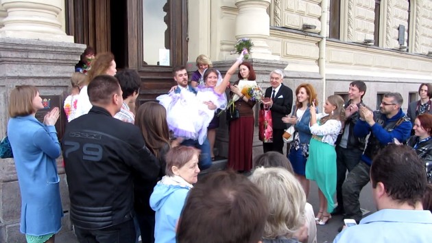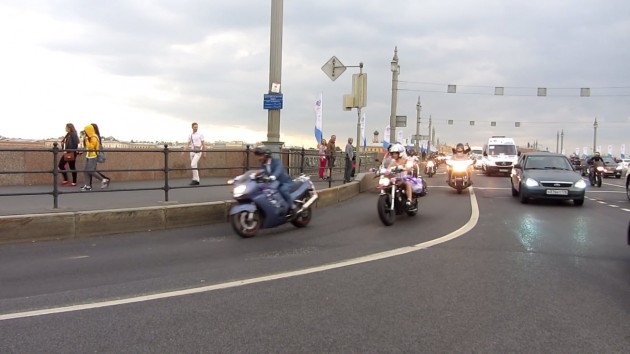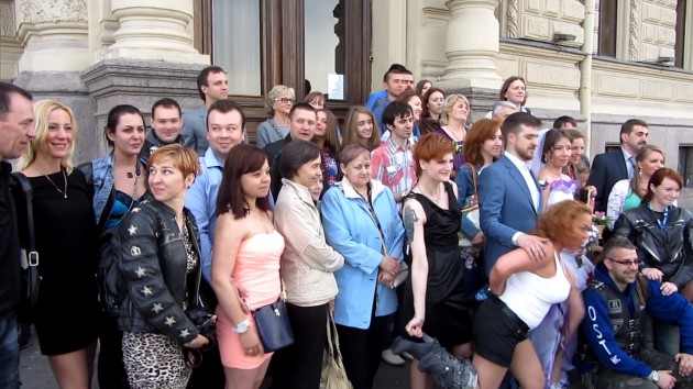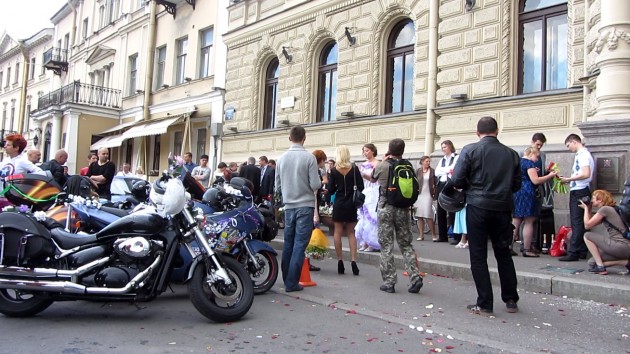 Ну а в общих чертах, в субботу 20-го июня толпа мотоциклистов подъехала ко Дворцу бракосочетаний на Английской набережной, чтобы выдать Аришку за муж. Сама виновница с женихом прибыли на мотоциклах, как и положено на таком событии. Хотя, конечно, отсутствие экипировки и надетые вместо нее шикарное платье на невесте и классический костюм на женихе немного портили картину. Но не будем судить их строго. Может, постирали экип перед свадьбой, а он не успел высохнуть.