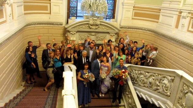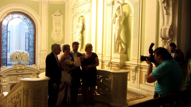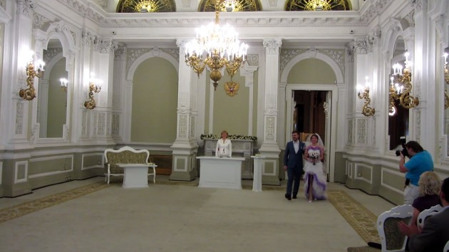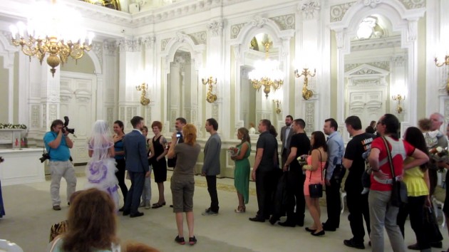 К празднованию «Белых Ночей» в скором времени Английскую набережную должны были перекрыть. Возможно зная об этом, отлаженная официальная машина торжественного принятия новых членов в ряды обладателей почетного штампа в паспорте в этот день работала четко и без задержек. Не успели молодожены и их гости подняться в залы ожидания, как их тут же пригласили в процедурный кабинет.