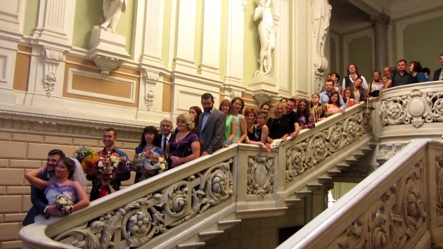 Когда я со свим фотоаппаратом на треноге поднимался по лестнице в зал, вслед за друзьями и родственниками жениха и невесты, местная пышногрудая дама преградила мне дорогу и ледяным тоном домоправительницы заявила, что с треногами низя! Снимать можно только с руки. Я довольно быстра догадался, что это требование вызвано стремлением сохранить паркет и мысленно сделал ставку, что ковра в зале не будет. Иначе молодоженов заставили бы надеть бахилы.