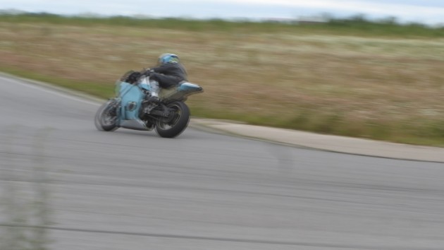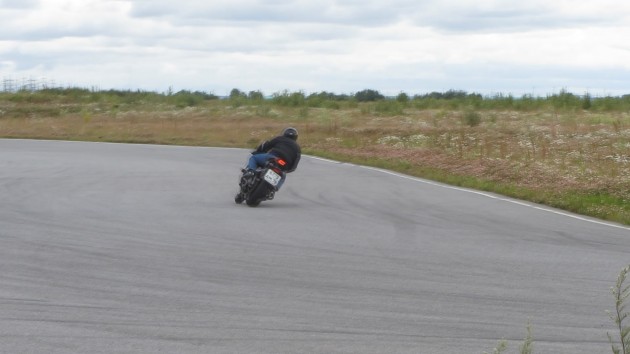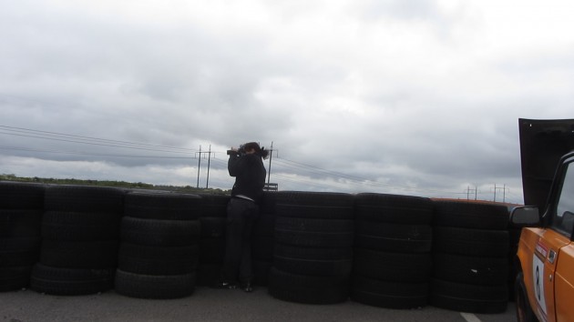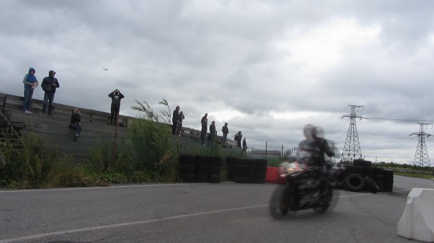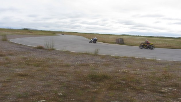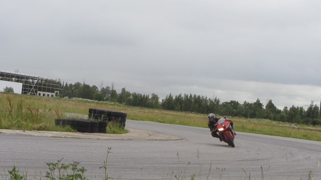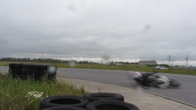 Слава Мотогон был занят организационным процессом, и не хотелось ему мешать, поэтому я отправился снимать заезд в то место, которое казалось мне наиболее перспективным. Это выход из так называемой «улитки», кругового участка с крутым внешним поворотом в конце. Перекладывая на этом повороте мотоцикл, райдеры часто не вписываются в границы асфальта и вылетают на гравий. Как настоящий охотник, я надеялся подстрелить там жирную утку, то есть сделать запись вылетающего с трассы гонщика.