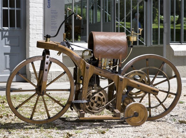 К 1885 году его двигатель был готов, осталось лишь найти ему применение. Самым логичным и простым решением было поставить двигатель на велосипед. Мотоцикл был запатентован как «повозка для верховой езды с керосиновым двигателем». Полностью воплотить идею в жизнь решился сын Готлиба – он поставил двигатель на деревянную раму велосипеда и отправился в путь.