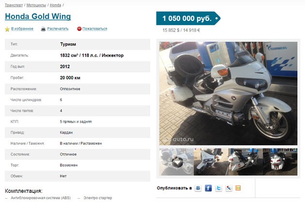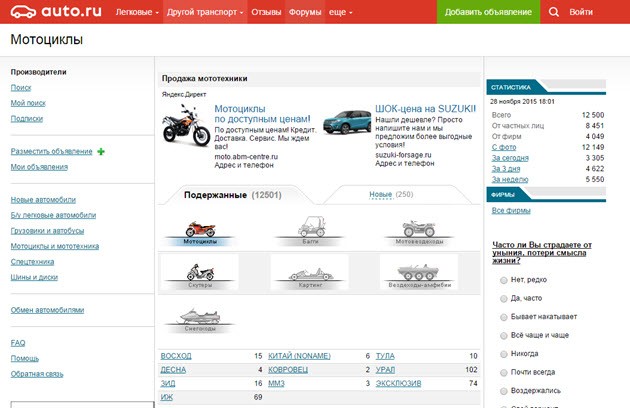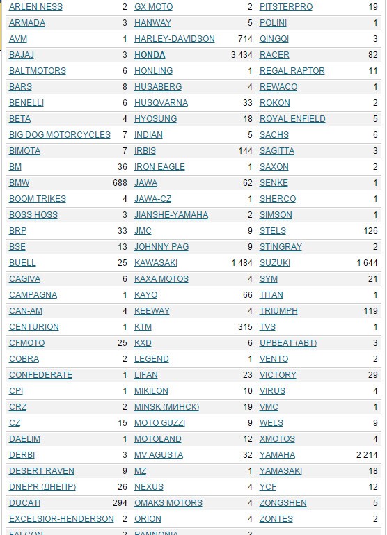 Там вы увидите пугающую кучу производителей, но легко сможете понять, кто лидирует на рынке. Вы увидите, что больше всего торгуется мотоциклов HONDA (3500), затем YAMAHA (2277), SUZUKI (1670), KAWASAKI (1506), HARLEY-DEVIDSON (720), BMW (693), DUCATI (331), KTM (311), IRBIS (137), STELS (127), TRIUMPH (120), УРАЛ (102). Остальные производители представлены единичными предложениям. Это не говорит о плохом качестве их продукции, но выбирая производителя, чьих моделей больше представлено на рынке, вы в дальнейшем легче найдете специалистов по их ремонту, запчасти и владельцев таких же мотоциклов, как у вас, чтобы задать им вопросы. При покупке вы сможете сравнить цены нескольких продавцов на одну и ту же модель и воспользоваться этим для торга с продавцом. Когда вы решите продавать свой мотоцикл, то не столкнетесь с проблемой, которая возникает у обладателей редких марок – ожиданием появления этакого эстета, который хочет именно ваш мотоцикл.