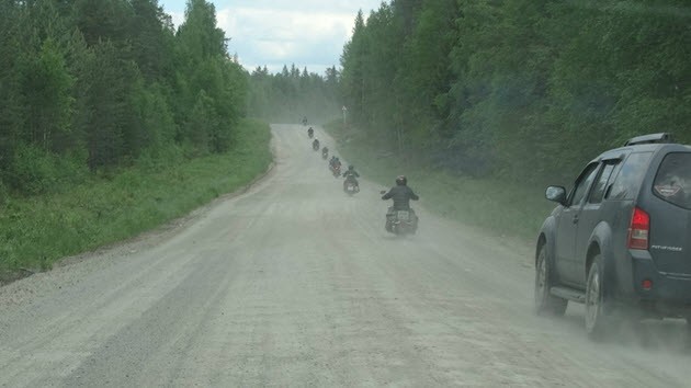 И вот состоялось это знаменательное событие – встреча двух культур, двух противоположностей, лентяев и трудяг. При всех регалиях, в парадной формы, с шикарным букетом слегка подвядших полевых цветов, с буханкой хлеба и солонкой на рушнике, мы вышли на Гимолский тракт, как хозяева Карелии, чтобы встретить дорогих гостей. К нам приближалась исхудавшая, вся в пыли, уставшая, но сплоченная лишениями и победами, немногочисленная группа из полутора десятков мотоциклистов. Двигавшаяся за ними машина подбирала отваливающиеся запчасти и припасы.
