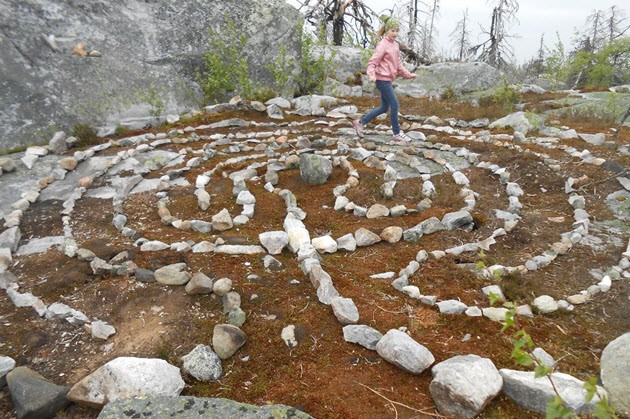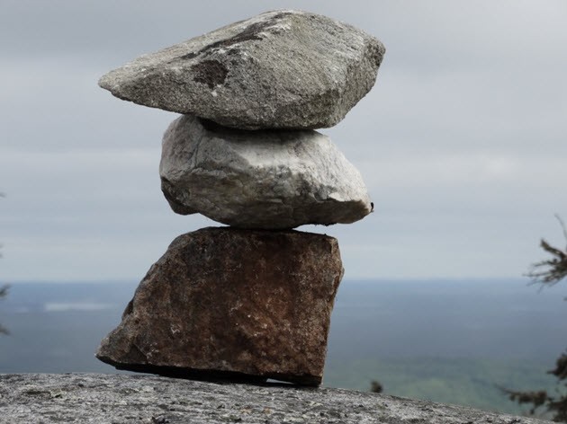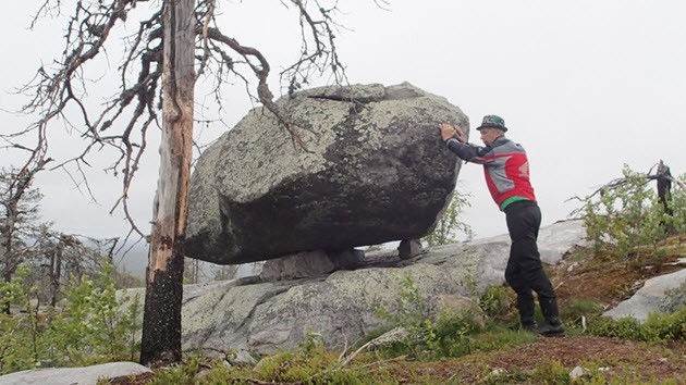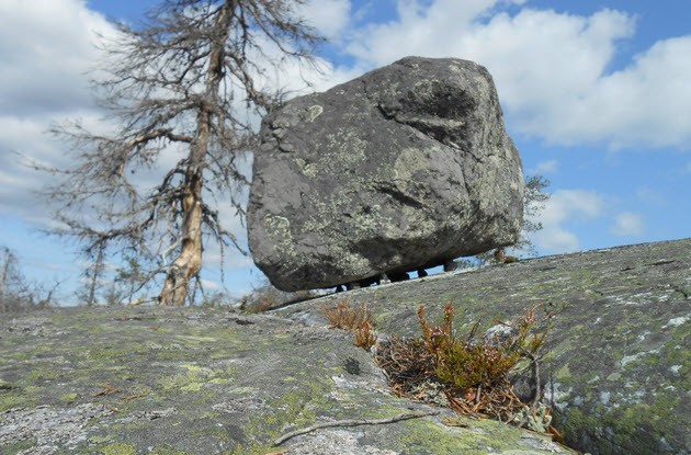 Однако, доехав до места и взобравшись пешком по почти отвесному двухсотметровому подъему, мы вскоре встретили наших путников. И в этот раз нам толком не удалось поговорить. Красота и большие размеры горы требовали времени на изучение каждого участка. Здесь было много огромных валунов, стоящих, как на ножках, на камнях поменьше. Здесь была «Лестница в небо», гранитные ступени которой природа вырезала не хуже современных мастеров. Здесь были объекты с правильными геометрическими формами: пирамида, пересекающиеся под прямым углом линии, квадраты и прямоугольники. Каменное царство поражало воображение, а на окружающие просторы открывался великолепный вид. Погода резко изменилась с дружелюбной в начале экскурсии до суровой буквально через час. Свистящий пронизывающий ветер и начавшийся мелкий дождь вскоре погнали нас к стоянке.