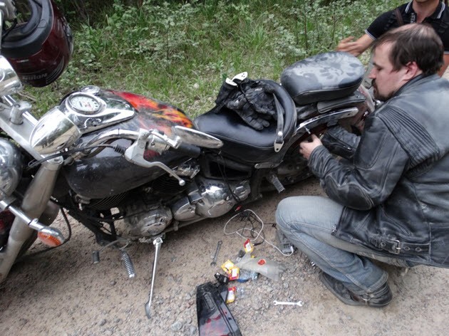 Однажды, собираясь на прохват «В Развалинах у Ведьмы», о котором я уже писал, я совершил ошибку, засунув одежду вниз, а потом заехав в магазин за продуктами. В результате, взбираясь в горку к лагерю в конце пути, я не смог удержать мотоцикл, и он мягко лег на бок на траву. Примерно полчаса я потратил в попытках поднять непослушного друга, а под конец не смог придумать ничего лучше, как начать уничтожать тяжелые припасы, лежащие сверху. Вот так, с бутылкой водки в одной руке и пакетом сока в другой, меня и застали подъехавшие друзья. Со смехом и криками «Что, не дотерпел 100 метров?» они помогли мне справиться с бедой.