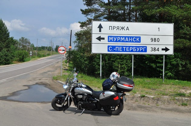Я договорился подождать друзей в Пряже, до которой было 250 километров. Надо было подумать о бензине, но заправок вдоль дороги было больше, чем достаточно. В городе я трачу 4-5 литров на 100 километров, так что 15-литрового бака хватает больше чем на 300 километров. Поэтому я заправился в Юшково и уверенно проскочил заправку в Лодейном Поле, о чем вскоре и пожалел. Великолепная прямая дорога почти без транспорта и сотрудников ГИБДД, позволяла двигаться с максимальной скоростью, но расход топлива увеличился до 6 литров, при этом все АЗС куда-то пропали. Вскоре мне встретилось первое серьезное препятствие – на подъезде к Пряже шел плановый ремонт дороги со всеми неприятностями – многокилометровой пробкой, слепящей пылью, гребенкой асфальта и вылетающими из-под колес камнями. Трясясь по кочкам, я с грустью наблюдал, как стрелка уровня топлива быстро бежит к нулю. К концу ремонтируемого участка красная лампочка давно горела, навигатор показывал 500 метров до АЗС, а дорога вела в горку. Крутанув ручку газа и набрав скорость, я услышал, как двигатель чихнул последний раз. Под пение птиц и похрустывание крошки под колесами, я взобрался на вершину холма, увидев слева под уклоном заветную колонка местной АЗС. Повезло!