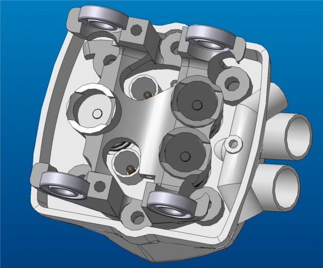 Так выглядела бы головка цилиндра, если бы содрать с нее оболочку, словно кожуру с апельсина. "Площадка", на которой стоят патрубки, это камера сгорания.