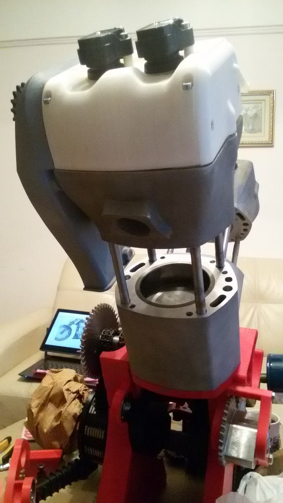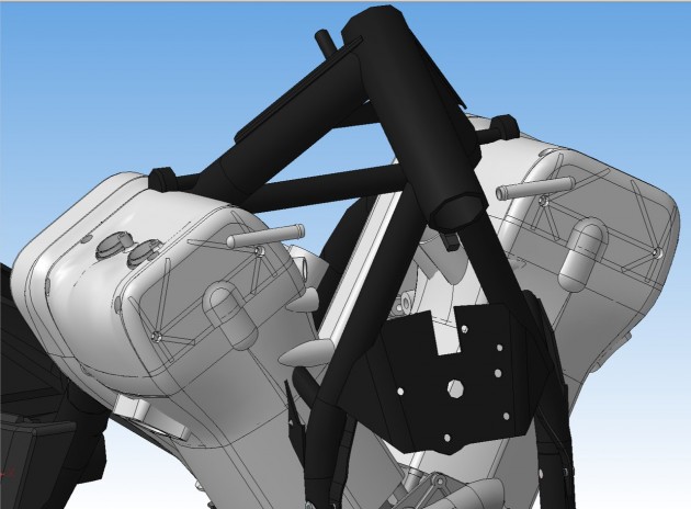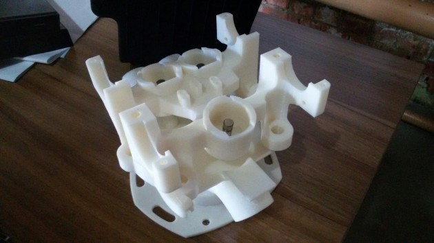 На снимках компоновочные макеты, изготовленные из пластика методом 3D-печати. Изготовление таких макетов позволяет убедиться, что при проектировании не было допущено грубых компоновочных ошибок. Например, проверяется удобство доступа к крепежу: перед выпуском детали в металле нужно иметь уверенность, что к любой гайке или болту можно без трудностей подобраться обычным набором гаражных инструментов. Проект «Русский мотоцикл», 21 июля 2015
