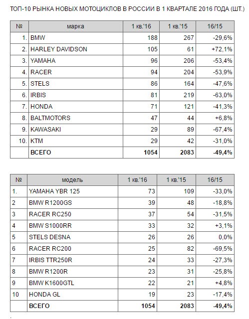 Аналитическое агентство «АВТОСТАТ» провело исследование рынка новых мотоциклов в России по итогам первого квартала 2016 года и составило ТОП-10 самых популярных марок и моделей. Согласно исследованию, объем российского рынка новых мотоциклов сократился почти в два раза (-49,4%) по сравнению с аналогичным периодом прошлого года и составил 1054 единицы.