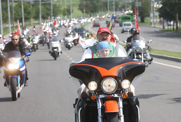 Глава белорусского государства прибыл на закрытие мотосезона-2016 года на байке вместе со своим младшим сыном Колей.