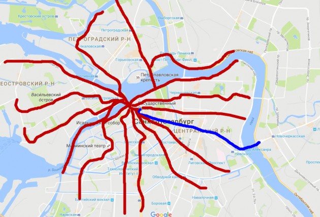 Хвост колонны выезжает с Дворцовой, когда голова уже преодолела мост Александра Невского (синяя линия на схеме). 200 000 мотоциклистов полностью заполнят все показанные на схеме магистрали в оба направления. Ну а 2 000 000 мотоциклистов полностью оккупируют центр города.