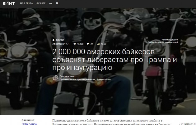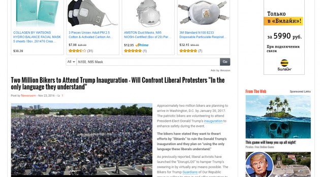 Итак, 21.11.16 на сайте rightalertspolls.com/do-you-support-patriotic-bikers-protecting-trumps-inauguration/ появляется часть новости, которая превращается в новость здесь www.angrypatriotmovement.com/support-bikers-who-defend-trump/ а потом попадает на более и менее достойный новостной сайт www.usapoliticstoday.com/bikers-for-trump-defending-trumps-inauguration/ В статье говорится о том, что 2000000 байкеров приедут в Вашингтон в день Инаугурации в поддержку Трампа против объявленной на это время акции либералов.
