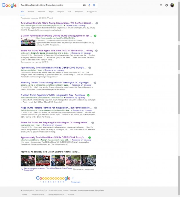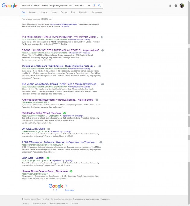Вкратце, изложенные ниже события выглядят так. Кто-то из американских консерваторов придумывает «газетную утку» про марш 2 миллионов байкеров в поддержку Трампа. Затем, без указания авторства, эта статья под другим названием публикуется где-то в глубинах американского интернета, на перегруженном рекламой всякой дряни никому не известном сайте. На следующий день перевод статьи появляется на нескольких патриотических сайтах рунета. Удовлетворяя вкусы аудитории этих сайтов, переводчик усиливает пафос материала, трактуя одно слово “libtards” запоминающейся потребителем конструкцией «молодых либерасов и либерасток» Далее материал расползается по одноразовым сайтам и пропагандистским новостным агрегаторам рунета, образуя информационное облако и обрастая новыми деталями. Так, к тесту добавляется «ЛГБТ», а потом история с 2 миллионами байкеров красиво вписывается в статью про частную армию Трампа. Это облако постепенно скрывает источник дезинформации. Затем, новость оставляется отлеживаться, чтобы поисковики ее хорошенько проиндексировали и стали выдавать целую кучу ссылок на соответствующий запрос. В итоге, через месяц она прочно закрепится в сети. Скорее всего, она скоро попадет в новостные телепередачи, ну а в день Инаугурации Президента США, когда пара тысяч байкеров будут эффектно двигаться из разных штатов в Вашингтон, она будет звучать из всех чайников нашей страны. Конечно, если к тому времени Трамп не успеет выкинуть что-нибудь типа турецкого «ножа в спину».