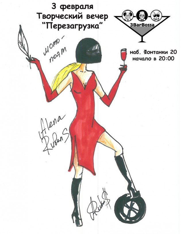 В пятницу судьба подарила мне редкую возможность побывать на творческом вечере любимой многими поэтессы-мотоциклистки Алены Рубенс. Еще не остывшие воспоминания от этой незабываемой встречи я попытаюсь изложить в коротком эссе, дополняя их навеянными бурей рифм и скрытых смыслов мыслями. И пусть кто-то решит, что слава Тохи Бороды не дает мне покоя, но я действительно не стремлюсь к его недосягаемым вершинам, а лишь делаю первые неуверенные шаги по тонкому льду литературных экспериментов. Понять и простить – вот все, что я прошу у строгого читателя.