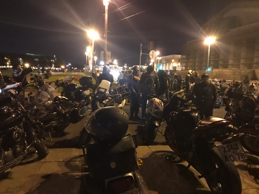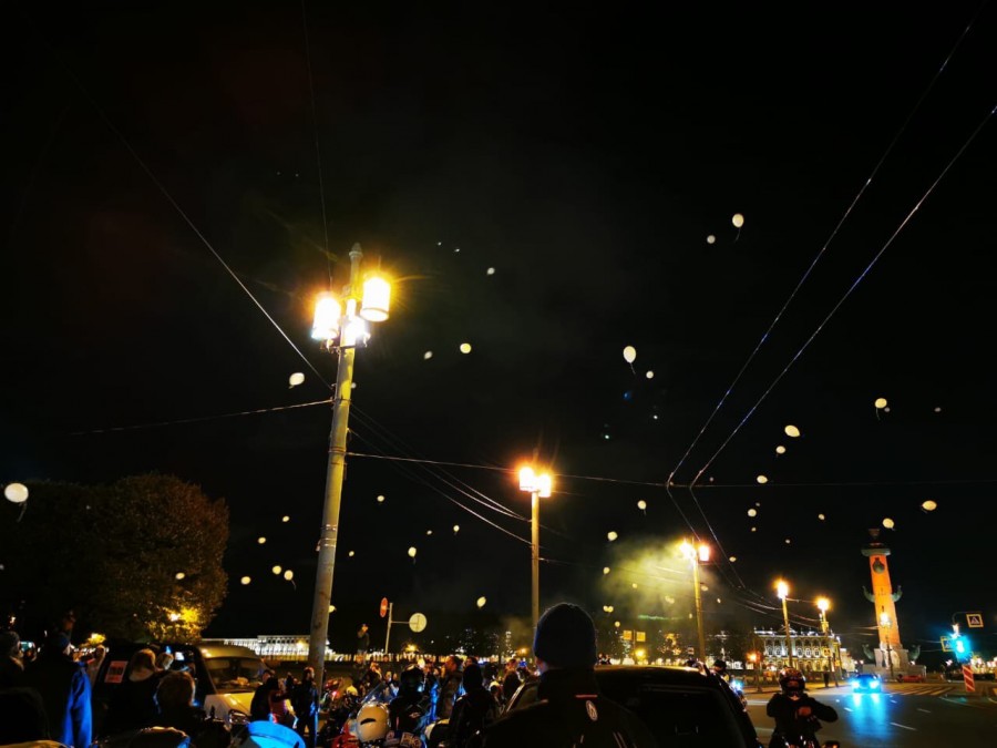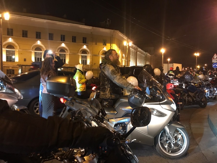 После церкви все вернулись на стрелку, где под рев моторов и звук клаксонов запустили в небо белые воздушные шары в память об ушедших мотобратьях.
