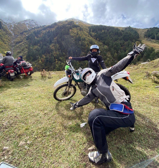 На мотоциклах по Мухинскому ущелью поднялись на высоту 3.5 километров к озеру Шобайдак, где успешно искупались. Красивые пейзажи, горы и яркие эмоции.