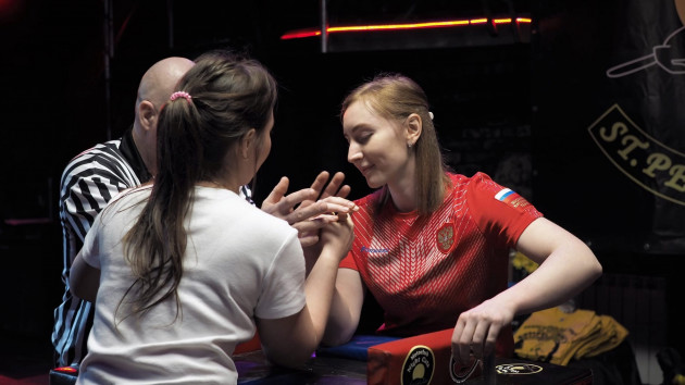Армфайт проходил по схеме: один поединок на левой и правой руке каждая с каждой. После шести схваток по три победы и одному поражению оказалось у Муравьёвой и Гридчиной. Жребий определил, что в суперфинал пройдёт на правой руке. Карина была близка к победе, соперницы ожидаемо разорвали захват и борьба продолжилась на ремнях, но уровень и мастерство Екатерины Гридчиной обеспечили ей заслуженную победу.