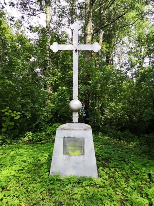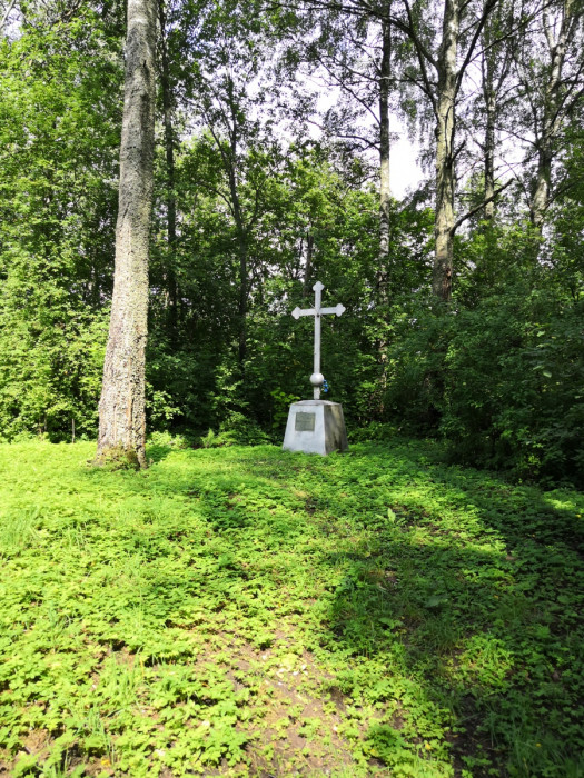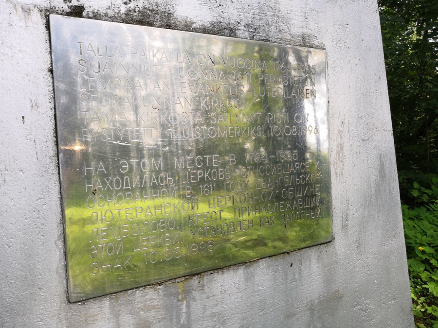 Итак, первая “точка на трассе” - это памятный знак на месте лютеранской церкви Лемболовского прихода. Знак представляет собой крест с маковки церкви. Церковь разрушена после революции. На кресте видны следы от пулевых попаданий. Есть информация, что это “красные комиссары упражнялись в стрельбе по кресту”. Я читал, что такое варварство происходило в то время весьма часто.