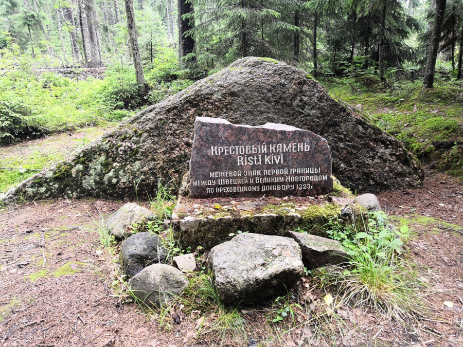 Далее, я двинул по этой дороге в сторону “Скандинавии”, минуя развязку с “Сортавалой”. Остановился посмотреть знаменитый “Крестовый камень”, в разное время обозначавший границу между Великим Новгородом в первом случае и Россией во втором со Швецией. Интернет говорит, что собственно “Крестовым камнем”, он называется за свои два креста, высеченных на нем в 1323 и 1595 годах, для обозначения вышеуказанной границы. Рядом с артефактом имеется еще один камень - памятная табличка, установленный краеведами летом 2000-го года.