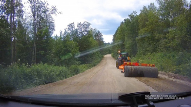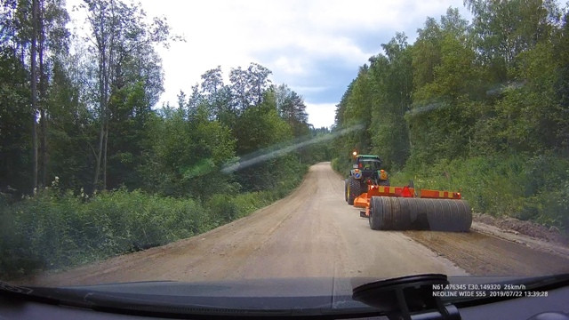 Дальше поехал в Лахденпохью. По дороге видел как грунтовку ровняют. Не, не грейдером. Трактор тянет этакую борону с двумя рядами “ножей” с “зубами”, а сзади еще ряд колес, которые сразу прикатывают грунт. Что-то типа катка. Классный агрегат! Мне бы такой, к садоводству дорогу ровнять…