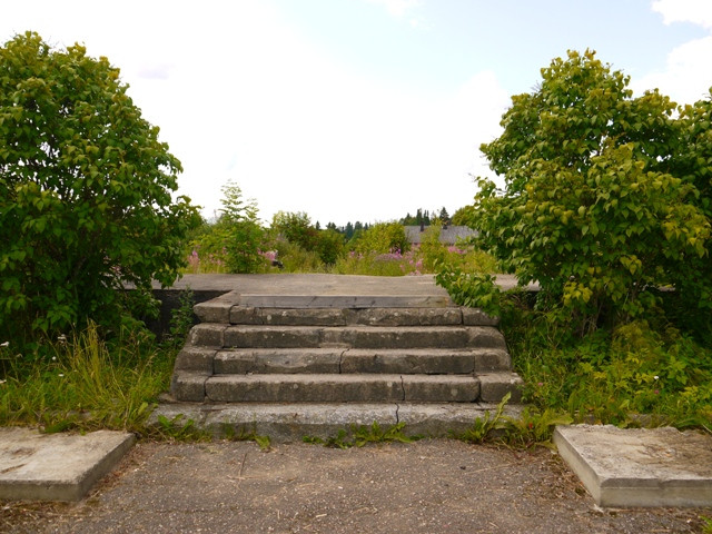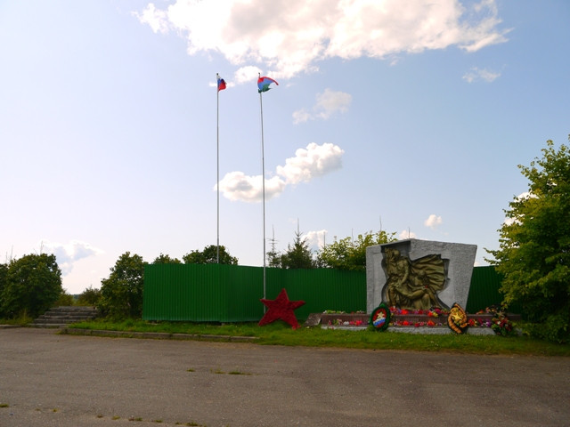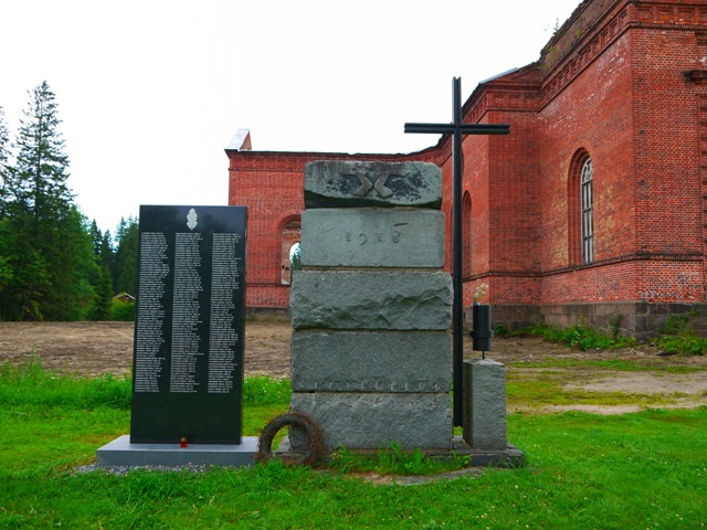 “Медленно спустившись с горы” :) я перебазировался в центр поселка. На центральную площадь, если так можно выразится. На дальнем от дороги краю площади расположились памятники советским и финским воинам. За памятниками, на холме фундамент финской церкви. Точнее трех финских церквей. Есть даже памятная табличка, что с 1660 по 1991 года здесь были три Куркиёкские церкви. Так же, чуть поодаль, имеется фундамент от памятного столба, упавшего в 2010 году от сильного ветра.