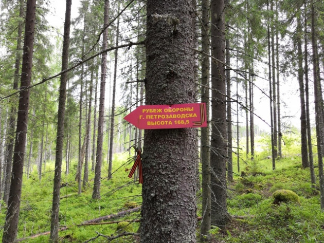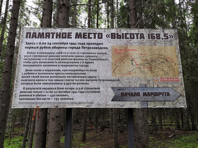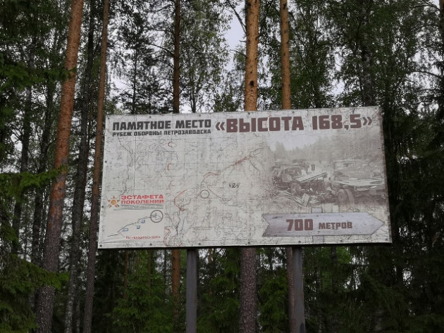 Многие знают, что Петрозаводск в годы войны был оккупирован финскими войсками. Но взятие города финнам далось очень не легко. Вокруг Петрозаводска были созданы четыре рубежа обороны. В Пряже я узнал о первом. Он находился примерно в пяти километрах в сторону Петрозаводска от того места, где я находился. По пути. И даже если бы это было мне не по пути, я бы все равно туда съездил. Данное памятное место называется "Высота 168,5". Здесь, почти весь сентябрь 1941 года, героические защитники Петрозаводска, ценой собственных жизней сдерживали противника и дали возможность эвакуировать раненых, мирное население и промышленные предприятия города.