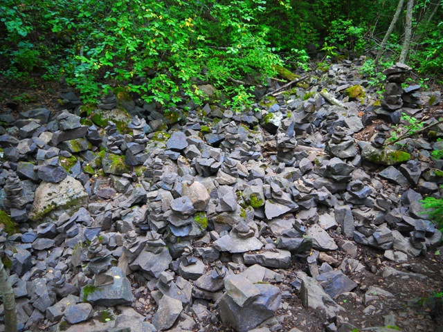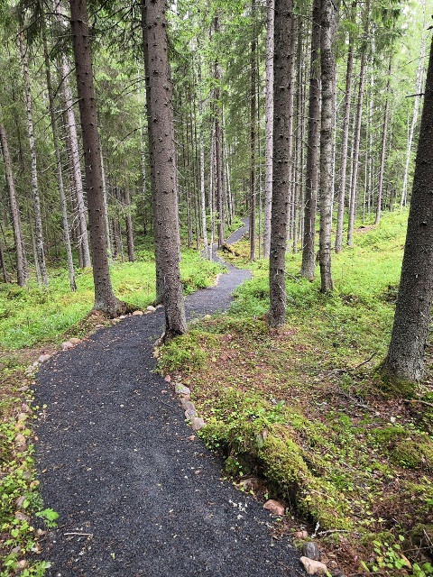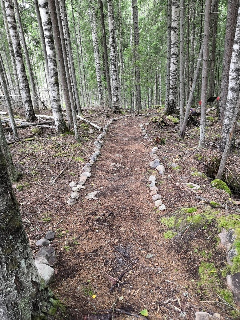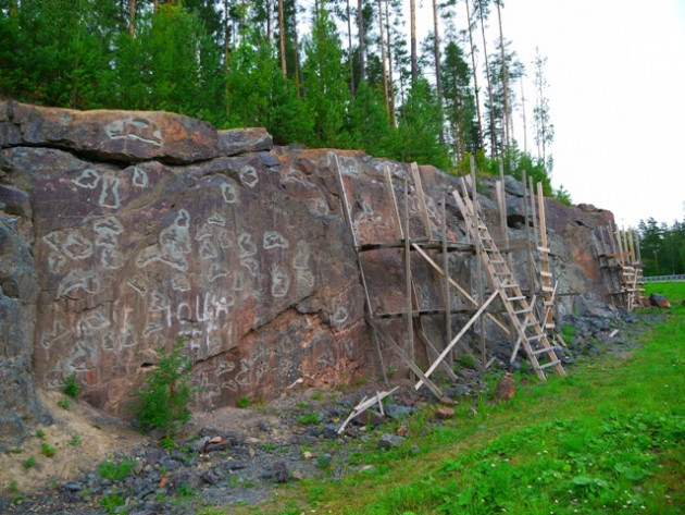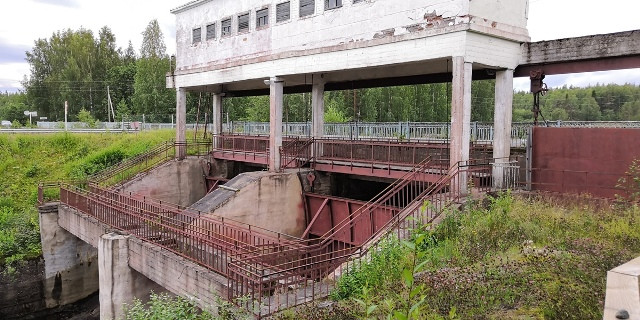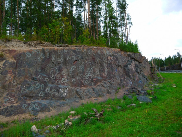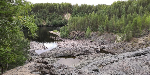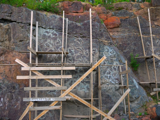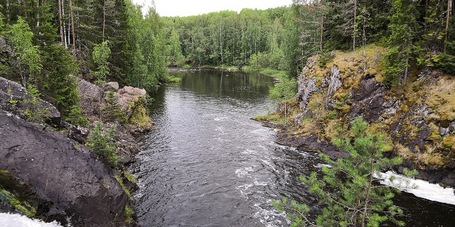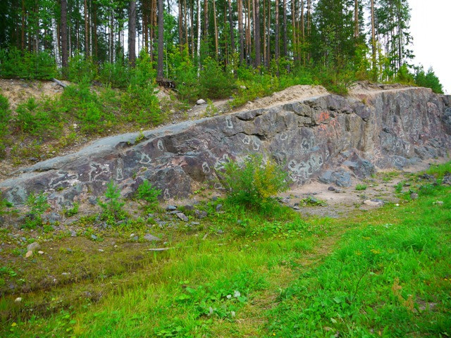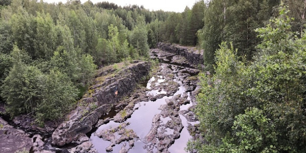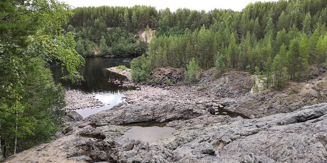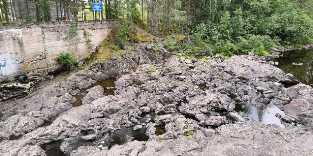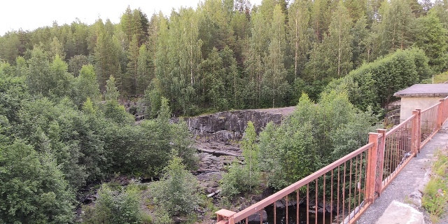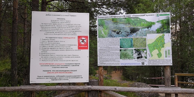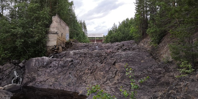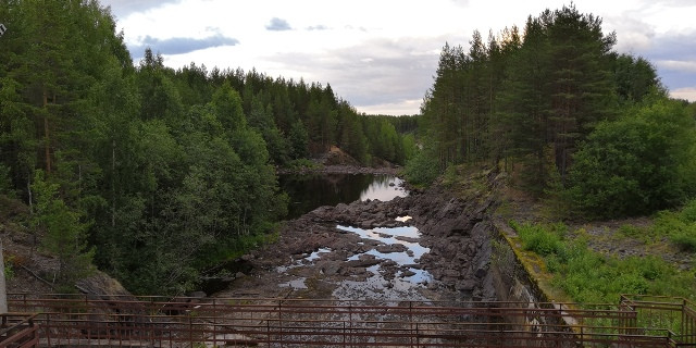 По другую сторону от водоспуска находятся информационные щиты о том, что здесь находится Геологический природный парк "Гирвасский вулкан". И действительно, имеется что-то типа небольшого парка. Еще есть тропинка с мостиком, по которой можно выйти на так называемый палеовулкан. Для непосвященных, это похоже на каменистое дно водоспуска. На самом деле, это застывшая вулканическая лава. Активные вулканические процессы происходили 3-1,5 миллиардов лет назад, которые непосредственно влияли на формирование ландшафта. Вулканическая активность сменялась периодами затишья более десяти раз.
