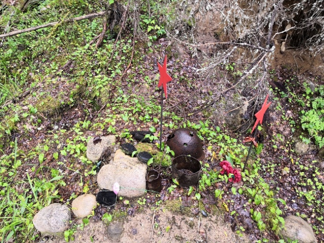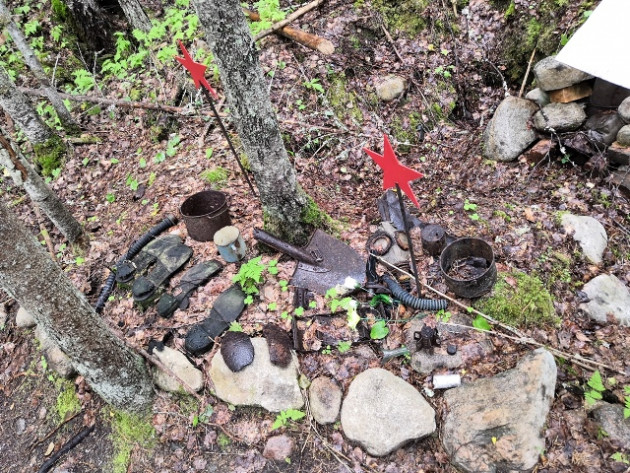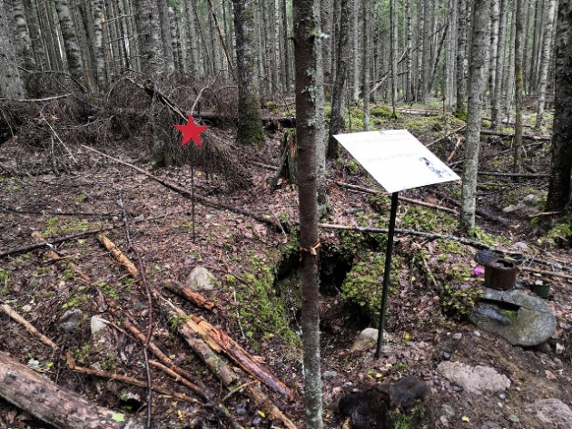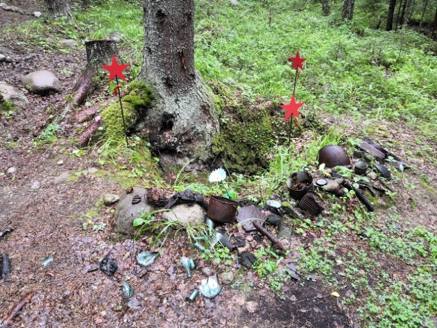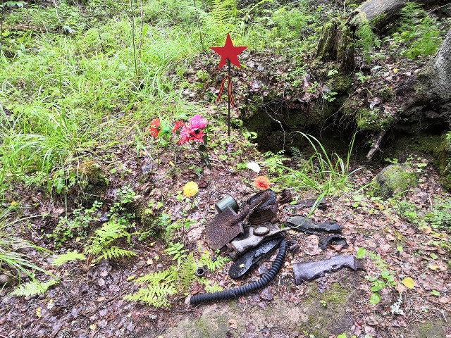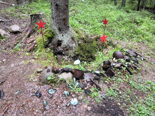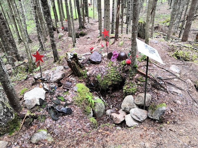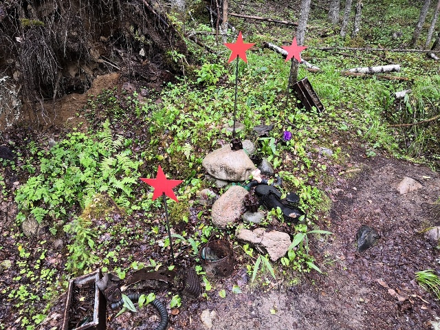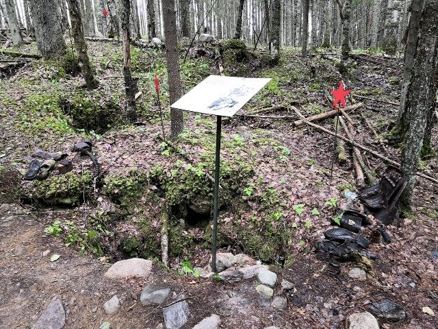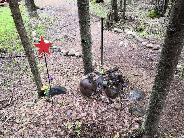 Создатели мемориала очень необычно, на мой взгляд, подошли к организации экспозиции. Около ям-раскопов, из которых были подняты останки бойцов, установлены красные звезды по количеству найденных останков, а также личные вещи и предметы амуниции, которые были при красноармейцах. Эти звезды были повсюду, куда хватало взгляда. По всей горе. Между деревьями и кустами краснели, куда ни обратишь свой взор. Эти красные звезды еще долго стояли у меня перед глазами... И в памяти засели прочно… Навсегда... А экскурсионная тропа, петляя, проходит почти через все раскопы. Ну, через большинство. Мимо всех этих звезд…
