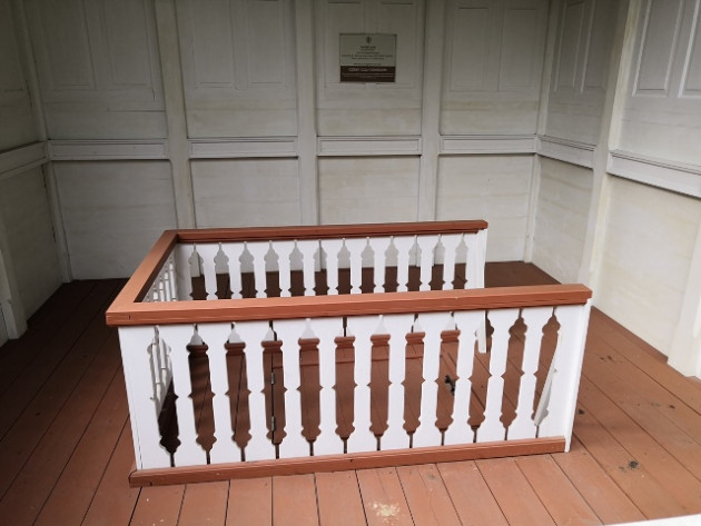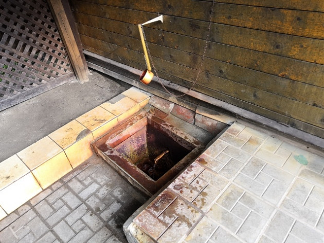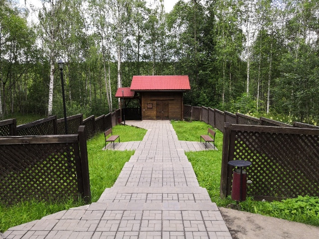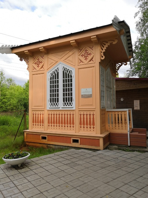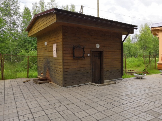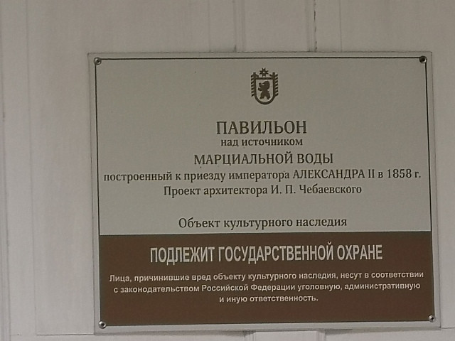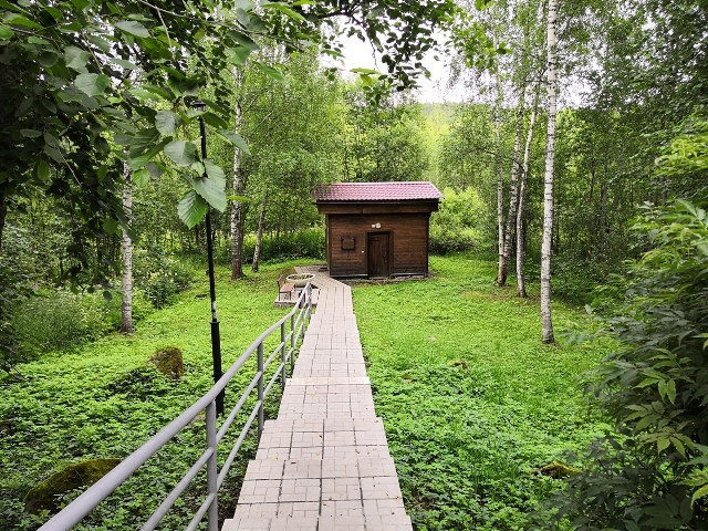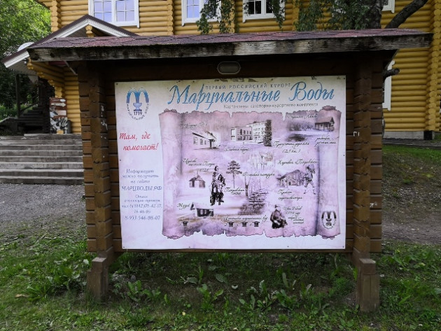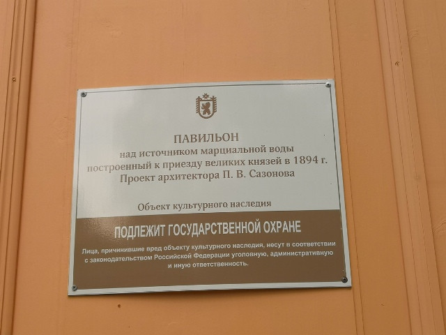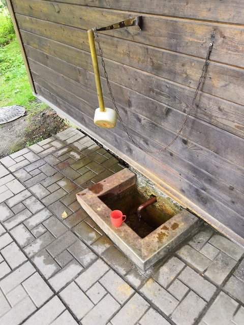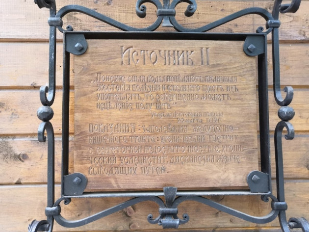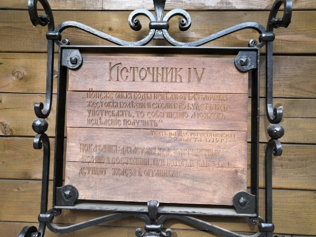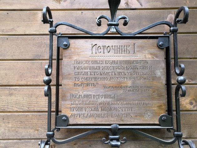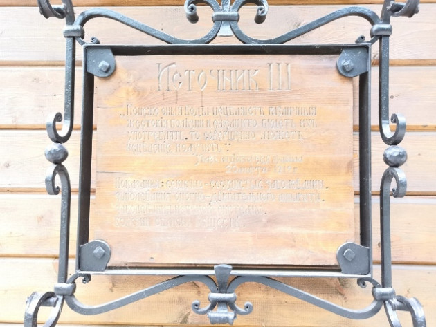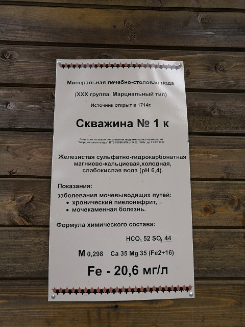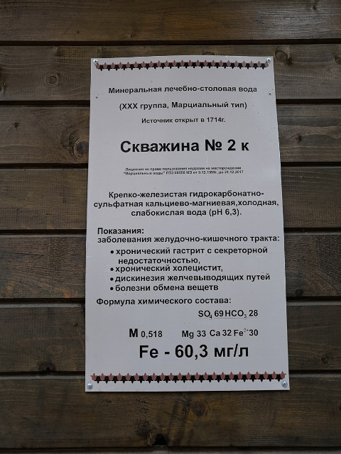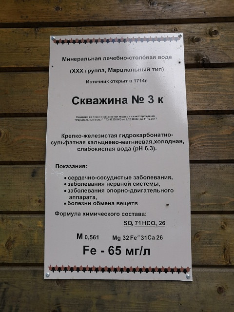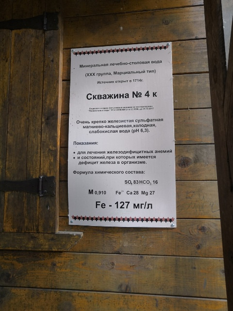 На подъезде к поселку меня неожиданно встретил автомобильный затор. Оказалось, что впереди велись работы по укладке асфальта на дороге, идущей через поселок. И парковочка, которую я приметил на карте, была занята дорожной техникой. Пришлось парковаться на улочке, идущей под углом налево от дороги. Вооружился я красной пластмассовой кружечкой, имевшейся у меня и пошел отведать водички и осмотреть достопримечательности. Собственно, из достопримечательностей были четыре железистых источника, заключенные в защитные домики, павильоны над источниками для царственных особ, и старинный деревянный дом, в котором располагался музей. Но в него я не ходил. Я опять начал с конца: с кружечкой фланировал от источника № 4 к источнику № 1. Набрал водички из одного источника и неспешно попивая пошел к следующему, глазея с интересом по сторонам и читая информацию о химическом составе воды в скважинах, и для лечения каких болезней она помогает. Никаких болезней у меня нет, посему я ее вкушал в профилактических и ознакомительных целях.