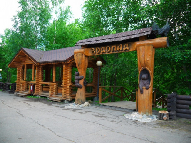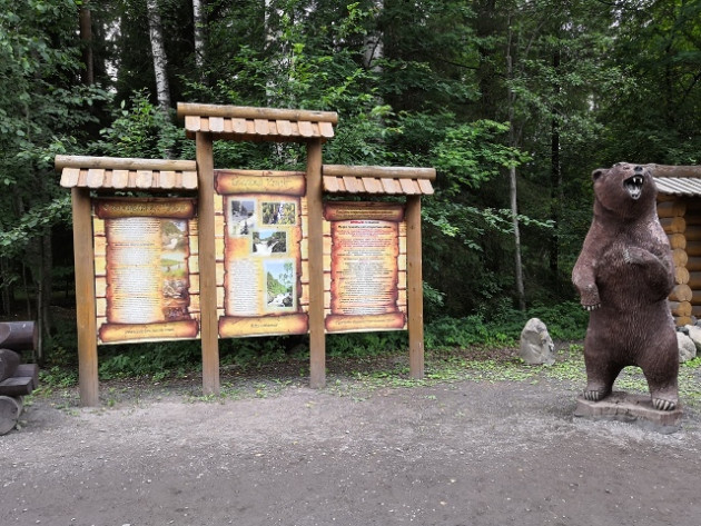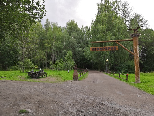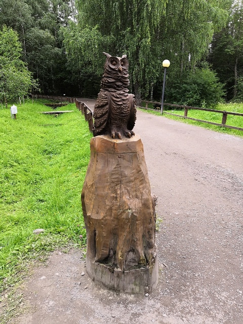 Вход стоил на то время 200р. Можно, в принципе, и въехать - есть парковка на территории. Но это тоже не бесплатно, да и не за чем. Народ селфится с деревянными медведями перед входом на главную дорожку к водопаду. Я не люблю этот жанр фотографии и поэтому просто сфоткал медведей. К водопаду я пошел по альтернативной дорожке, более длинной, у входа на которую стояли два мотоцикла Урал с колясками - куда интереснее! :)) Но еще была и деревянная сова.
